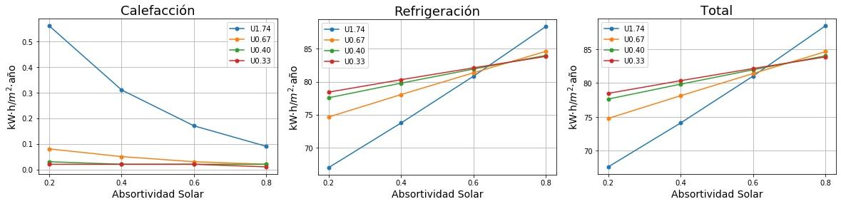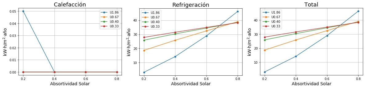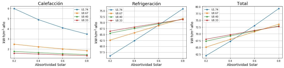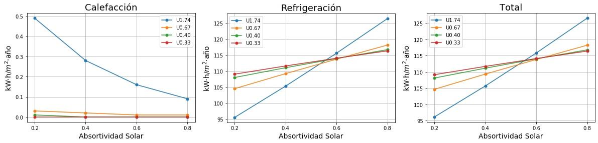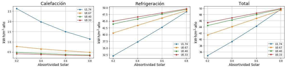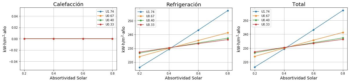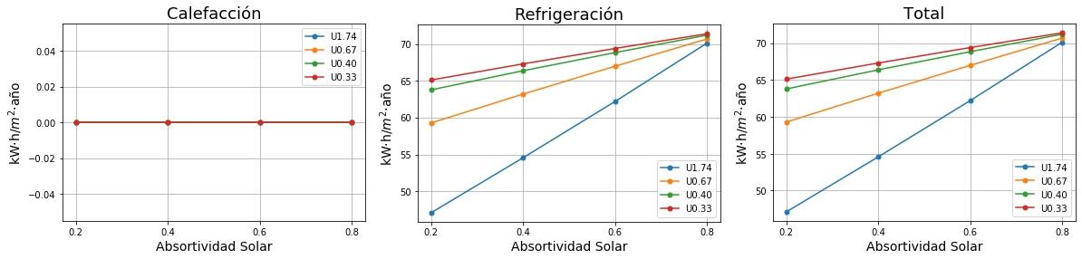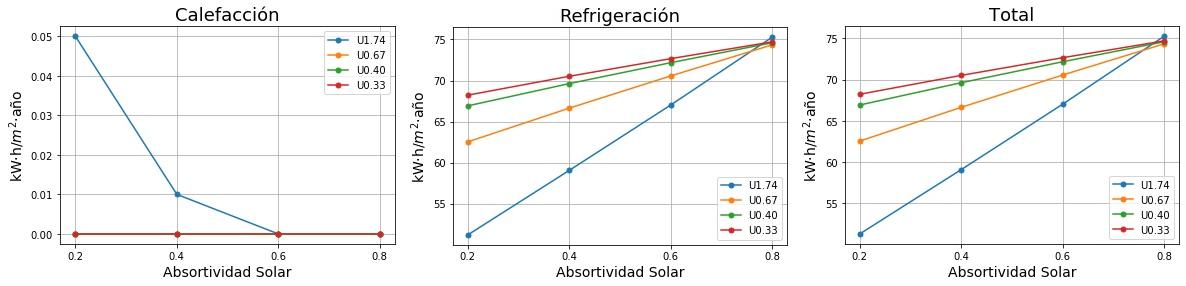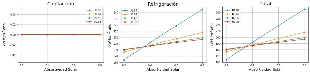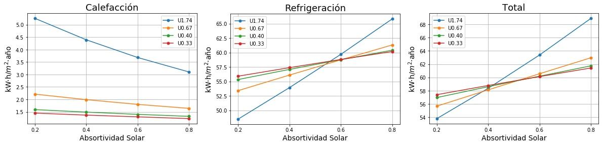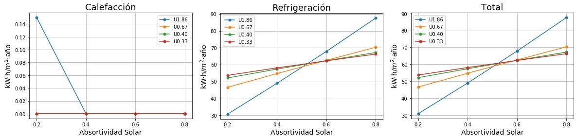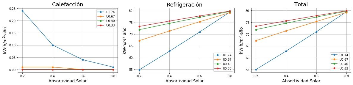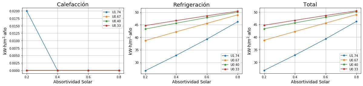 Consumos de calefacción, refrigeración y total en función de la absortividad solar del tejado para cuatro valores de Transmitancia térmica (U) del tejado. 0.2 sería un tejado fresco de color blanco y 0.8 un tejado estándar de color marrón
