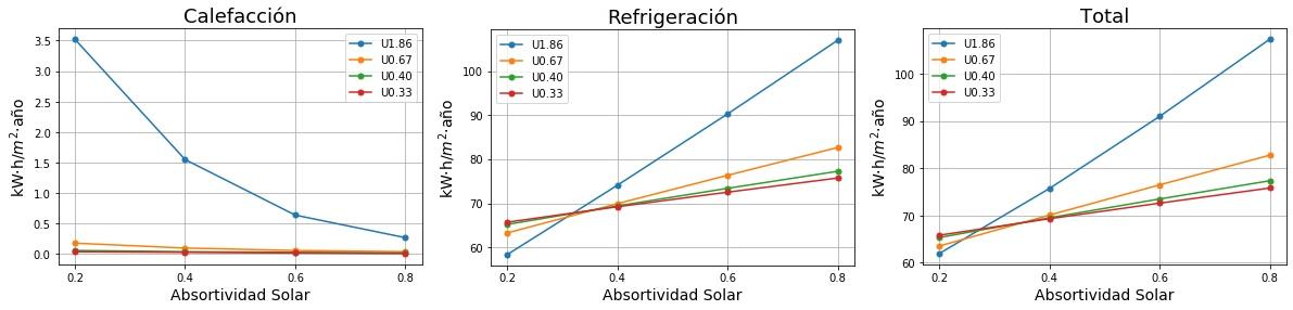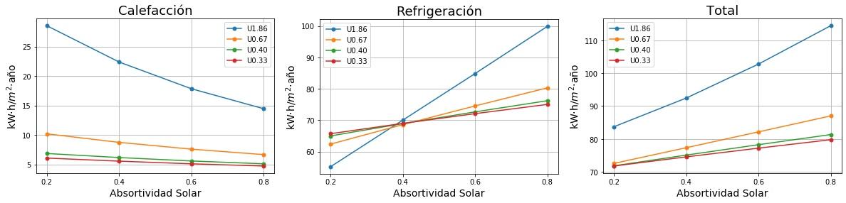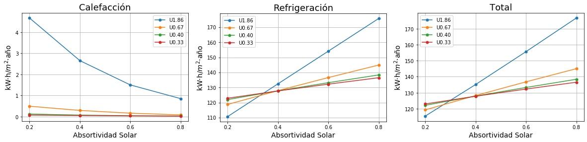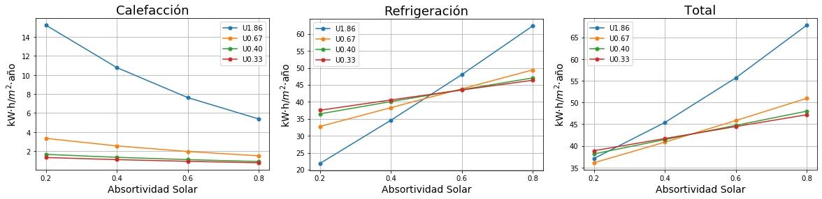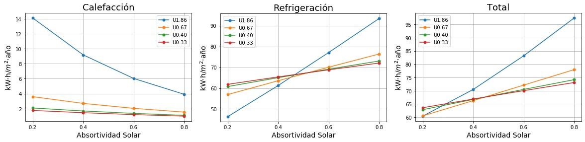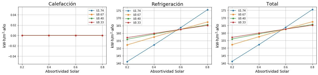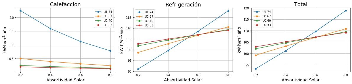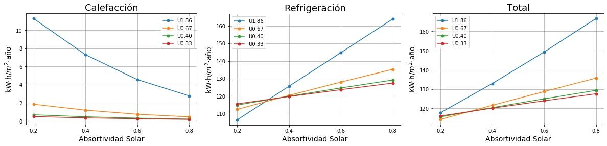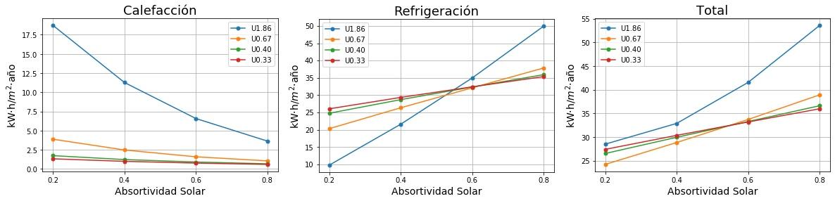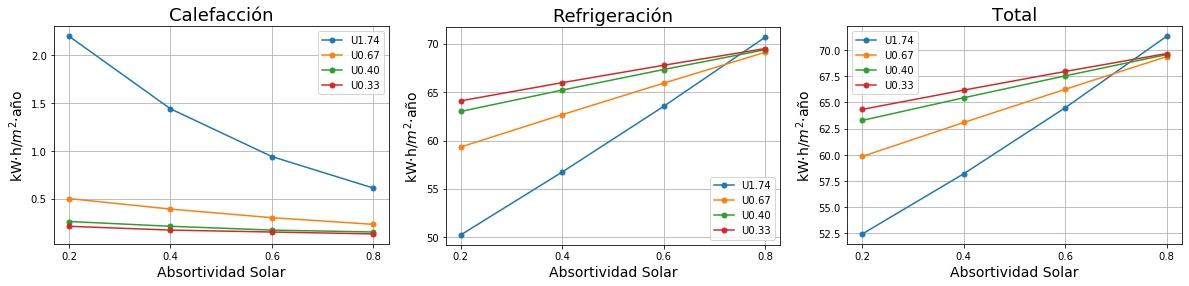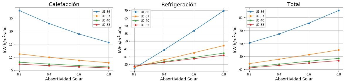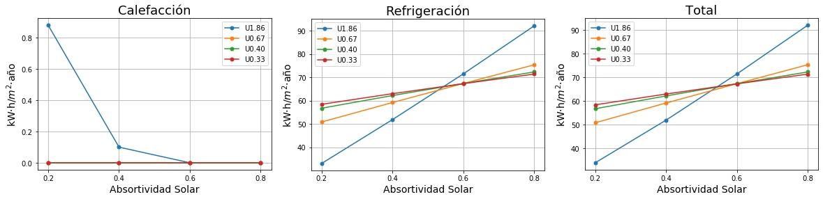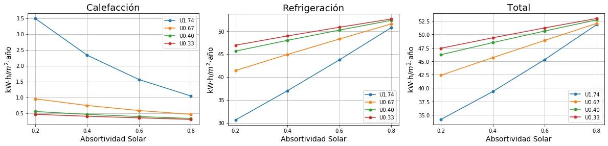 Consumos de calefacción, refrigeración y total en función de la absortividad solar del tejado para cuatro valores de Transmitancia térmica (U) del tejado. 0.2 sería un tejado fresco de color blanco y 0.8 un tejado estándar de color marrón