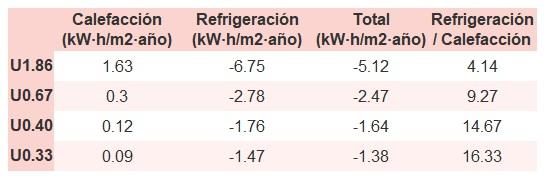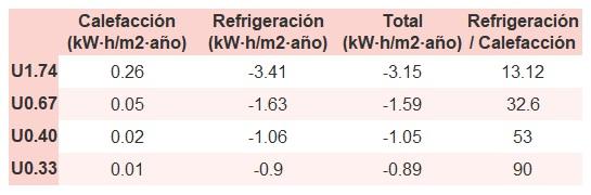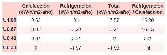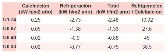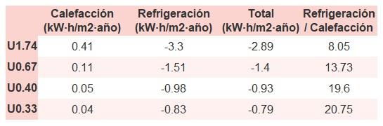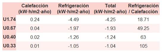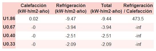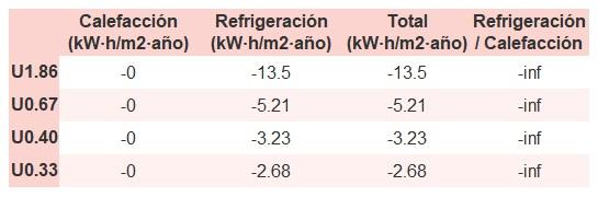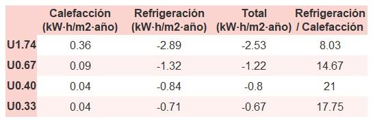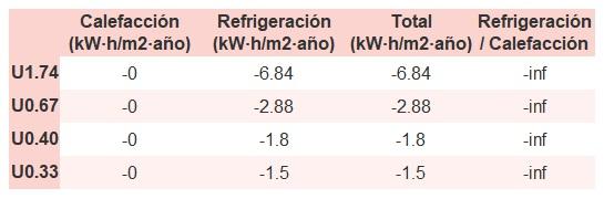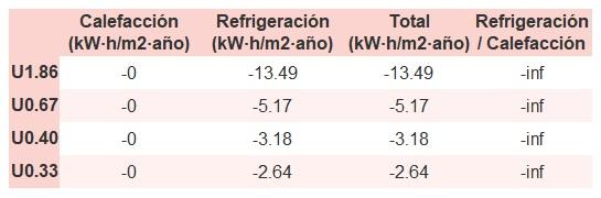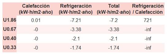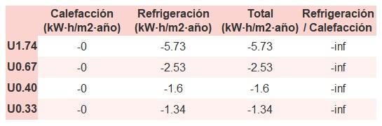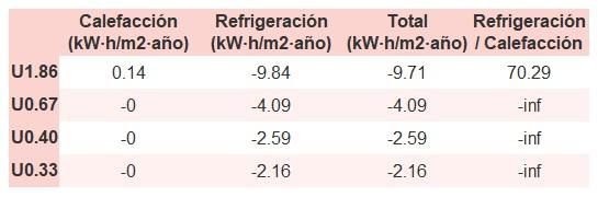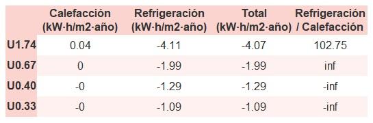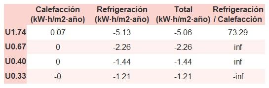 • Si «Total (kW·h/m2·año)» (penalización en calefacción menos ahorros en refrigeración) es un número negativo y «Refrigeración/Calefacción» (ahorros en refrigeración dividido entre penalización en calefacción) es mayor que 0, indica que el ahorro en refrigeración es mayor que la penalización en calefacción reduciendo la absortividad solar y utilizando un tejado fresco