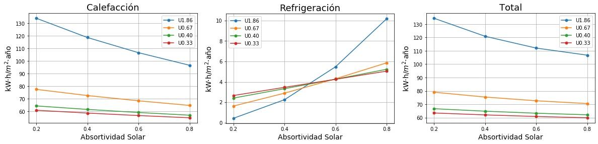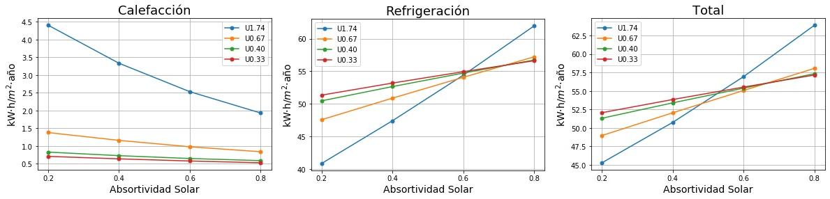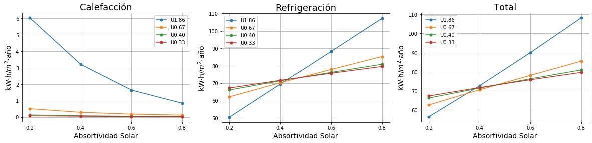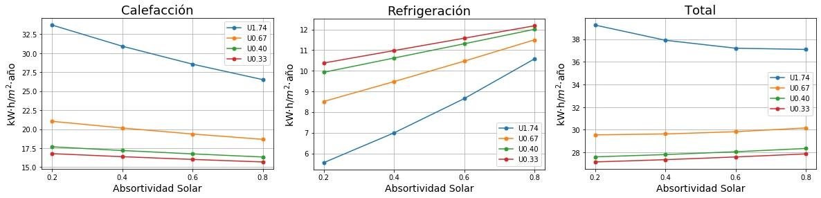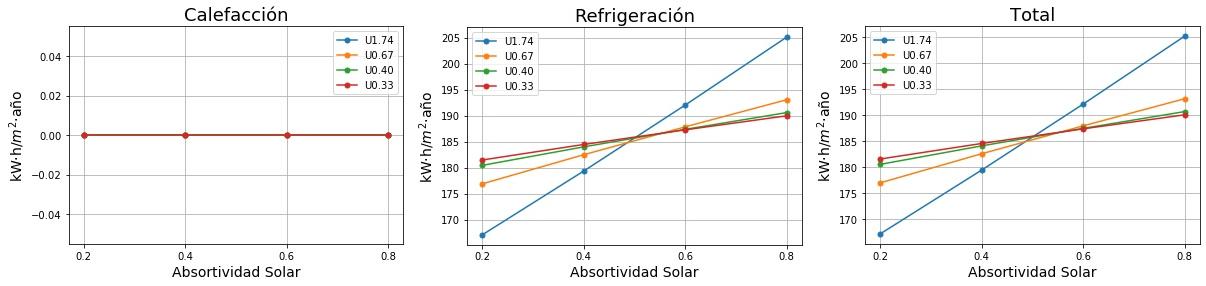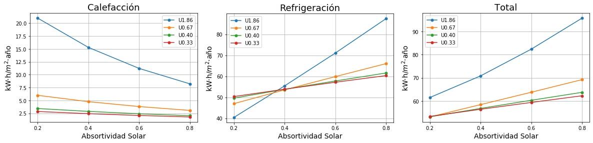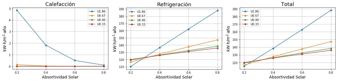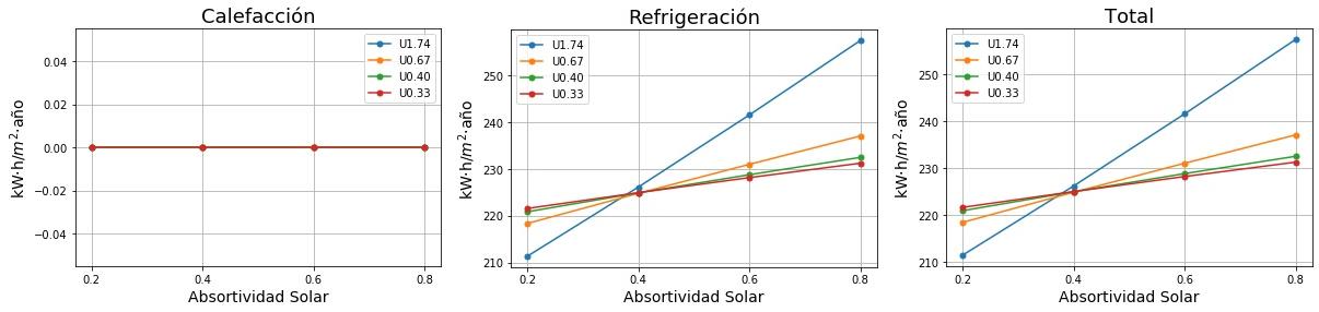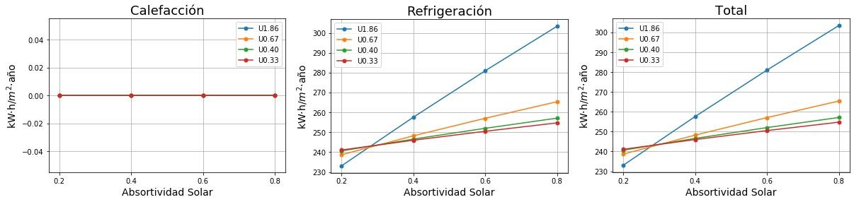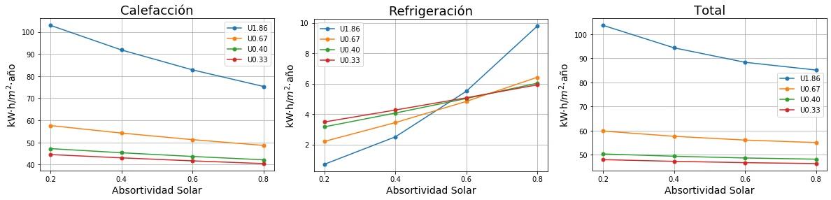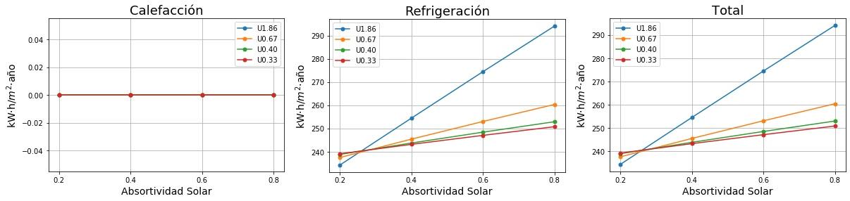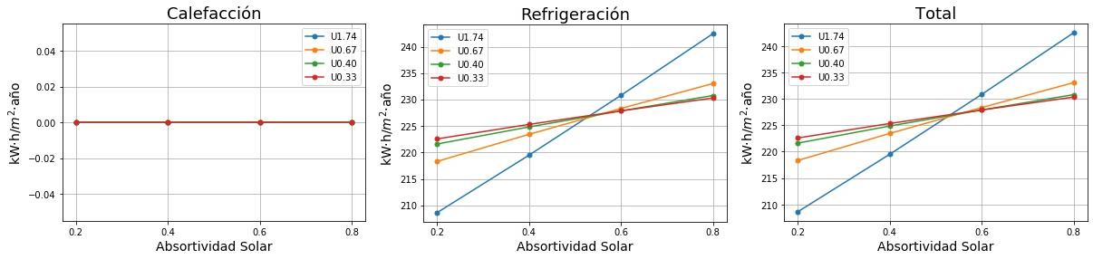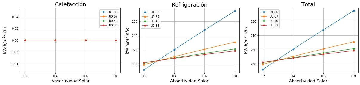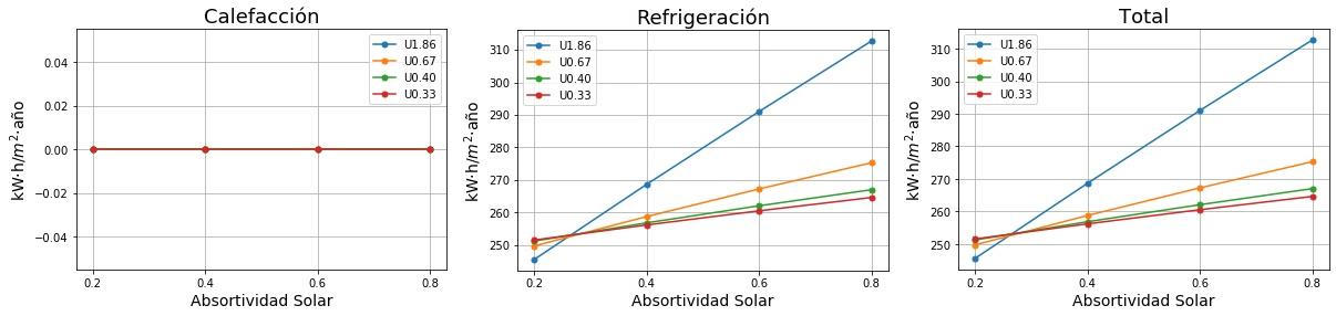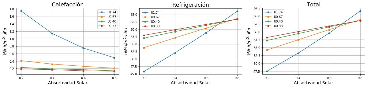 Consumos de calefacción, refrigeración y total en función de la absortividad solar del tejado para cuatro valores de Transmitancia térmica (U) del tejado. 0.2 sería un tejado fresco de color blanco y 0.8 un tejado estándar de color marrón