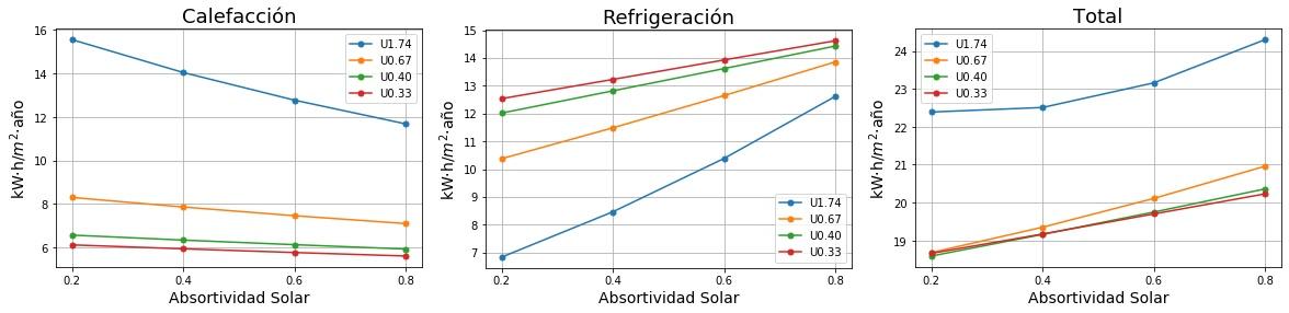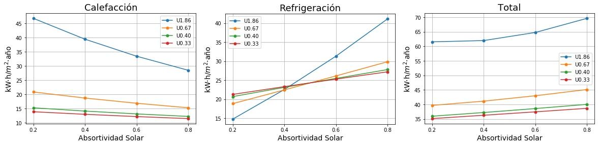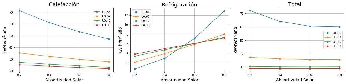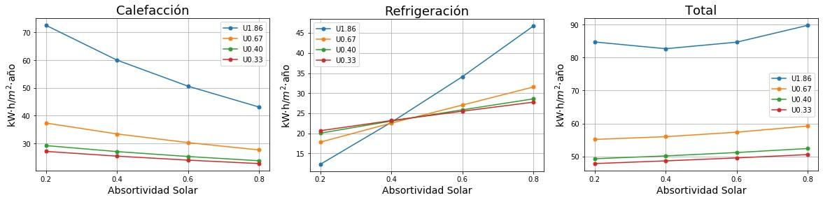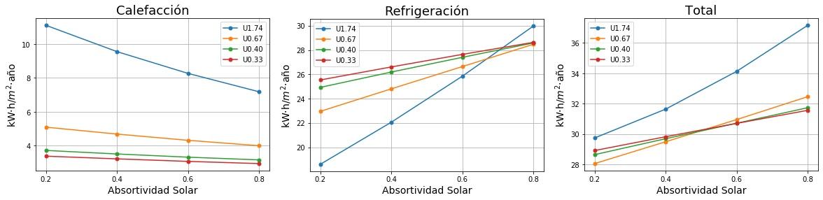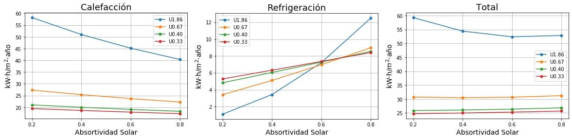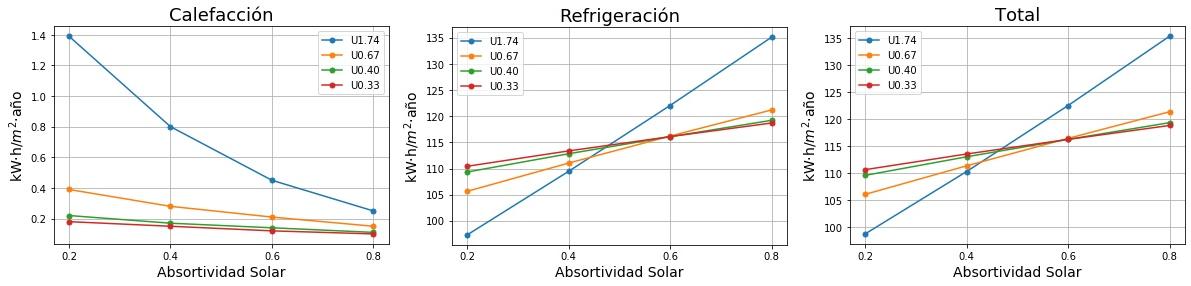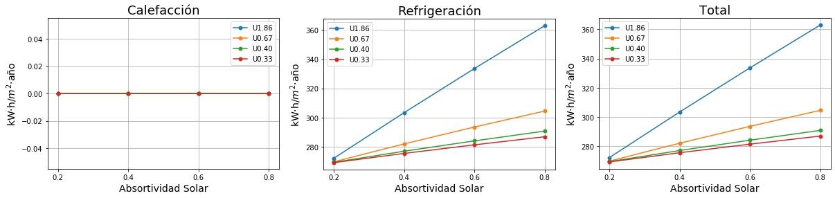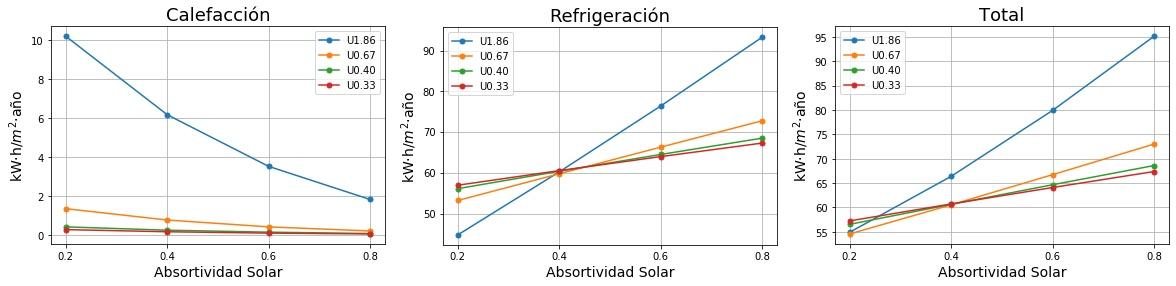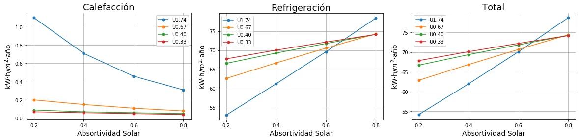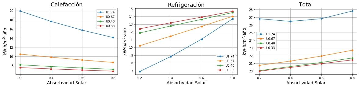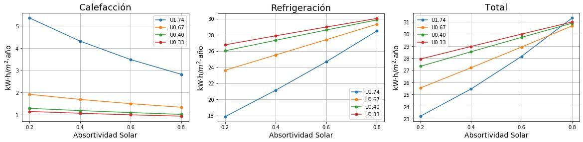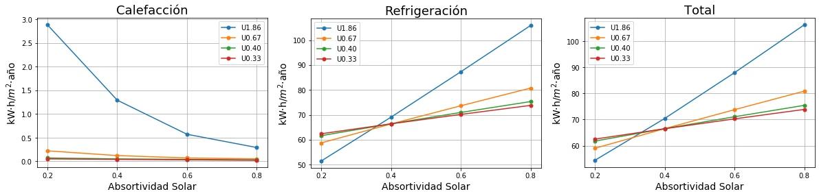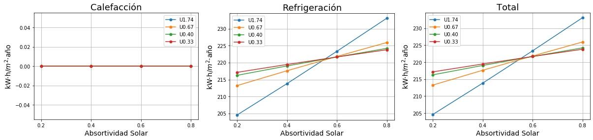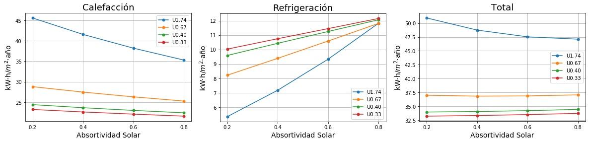 Consumos de calefacción, refrigeración y total en función de la absortividad solar del tejado para cuatro valores de Transmitancia térmica (U) del tejado. 0.2 sería un tejado fresco de color blanco y 0.8 un tejado estándar de color marrón