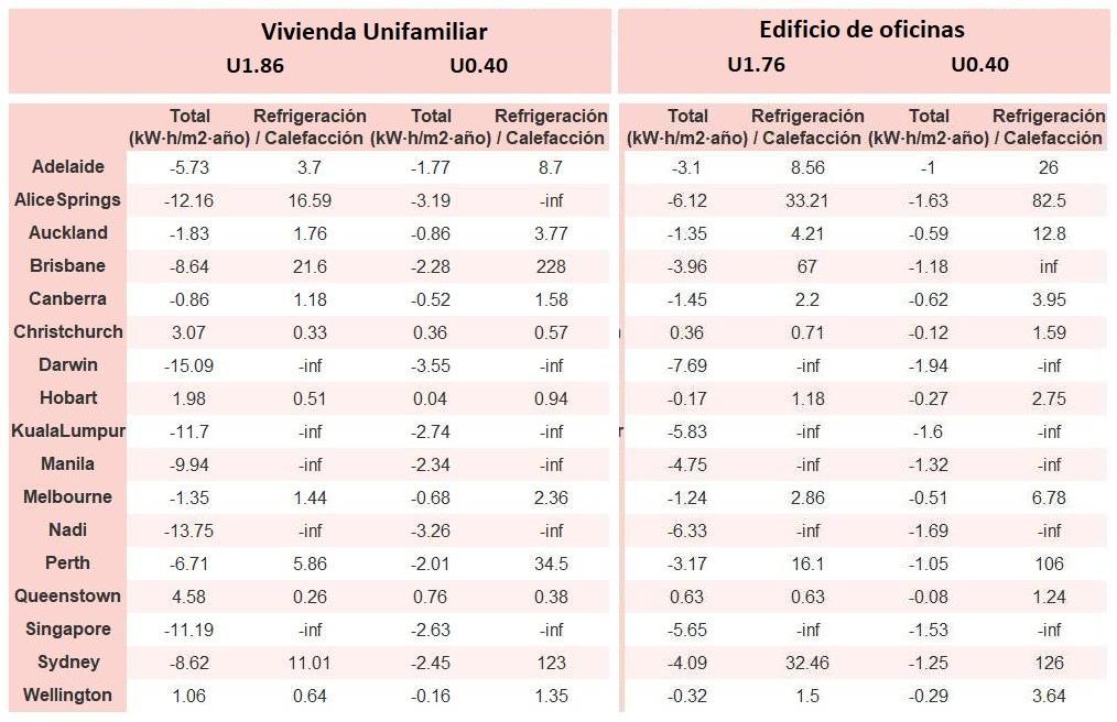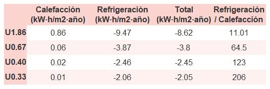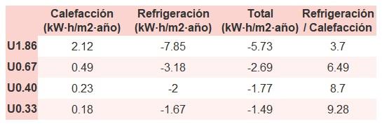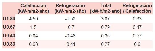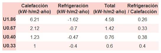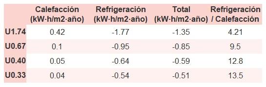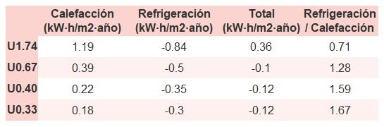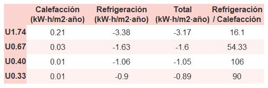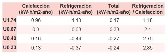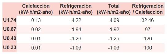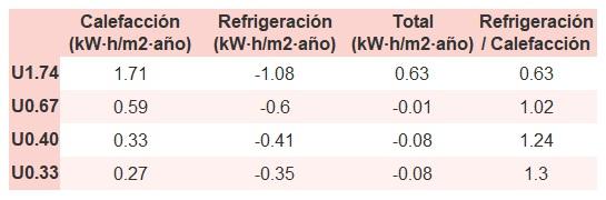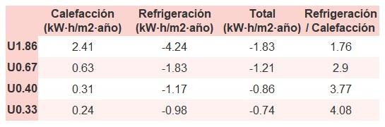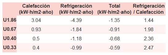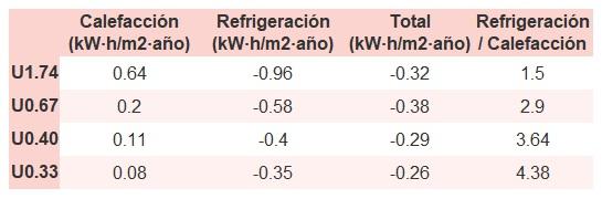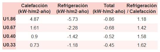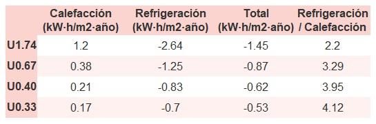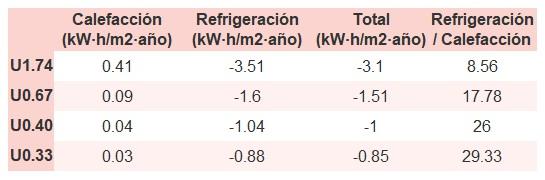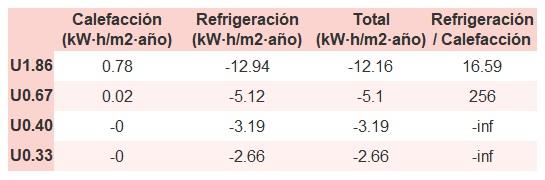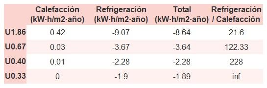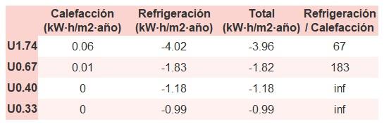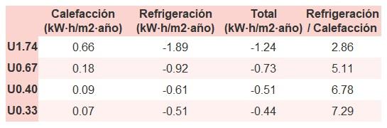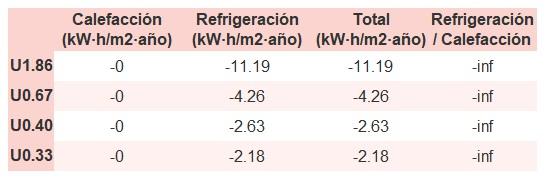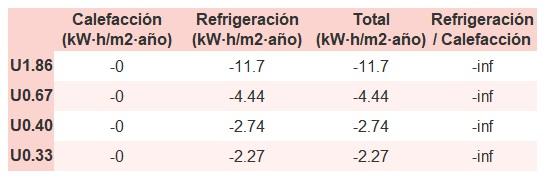 • Si «Total (kW·h/m2·año)» (penalización en calefacción menos ahorros en refrigeración) es un número negativo y «Refrigeración/Calefacción» (ahorros en refrigeración dividido entre penalización en calefacción) es mayor que 0, indica que el ahorro en refrigeración es mayor que la penalización en calefacción reduciendo la absortividad solar y utilizando un tejado fresco