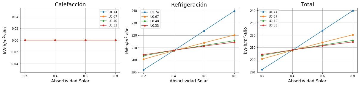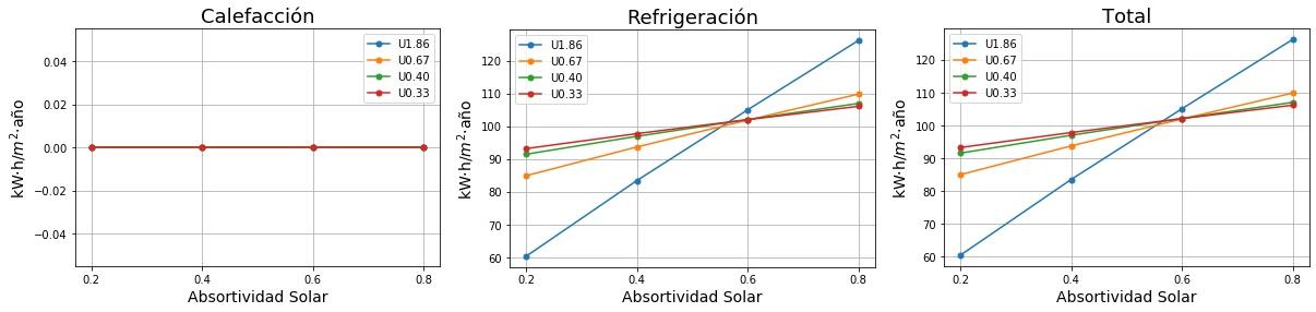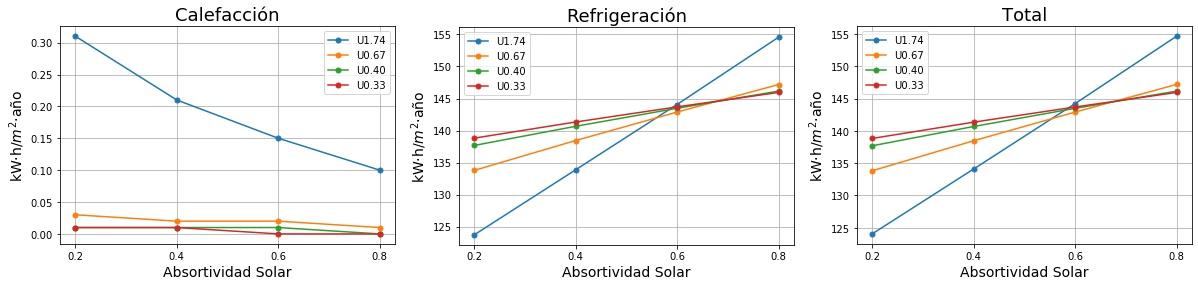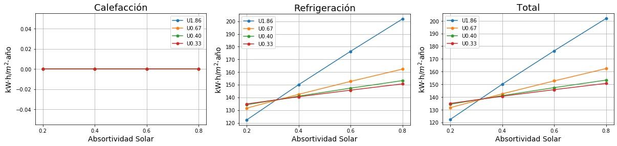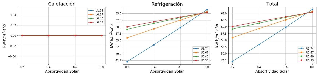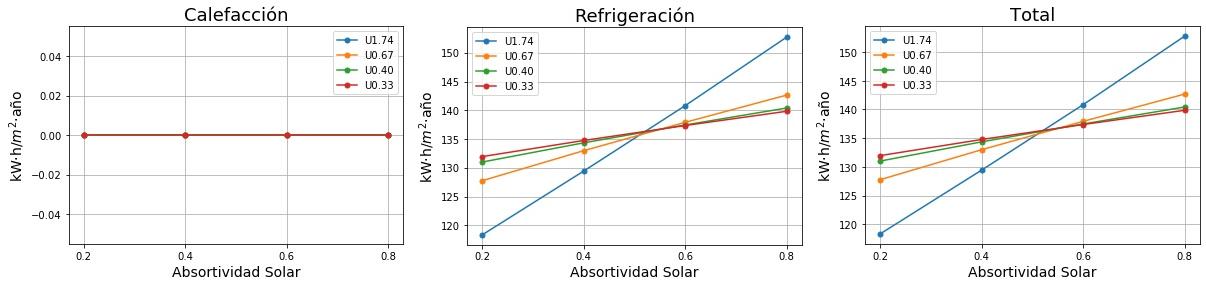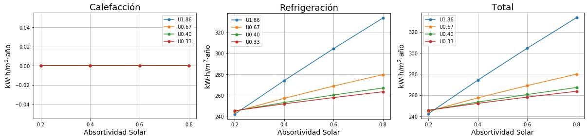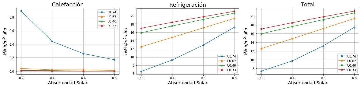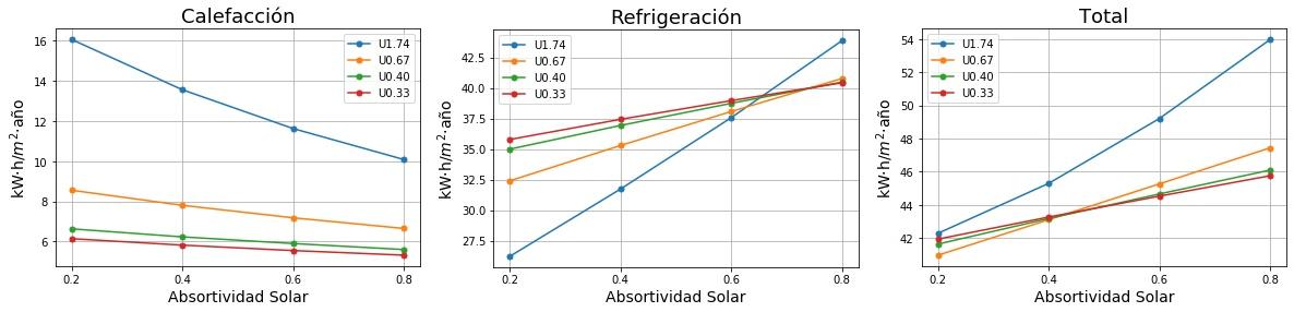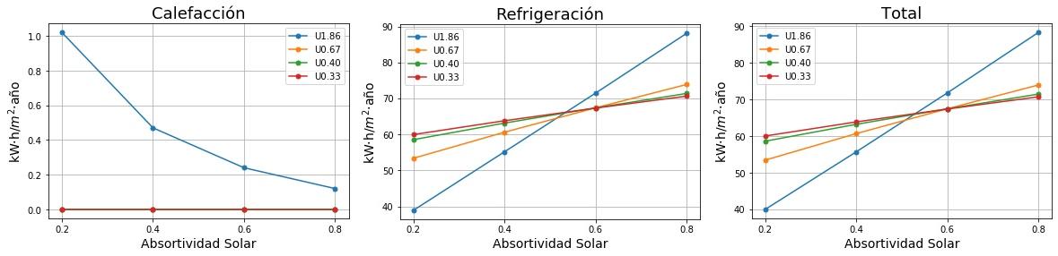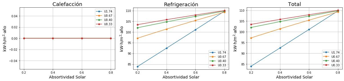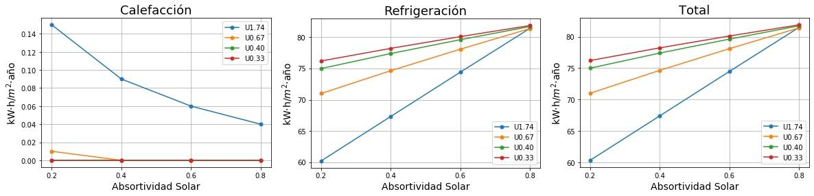 Consumos de calefacción, refrigeración y total en función de la absortividad solar del tejado para cuatro valores de Transmitancia térmica (U) del tejado. 0.2 sería un tejado fresco de color blanco y 0.8 un tejado estándar de color marrón