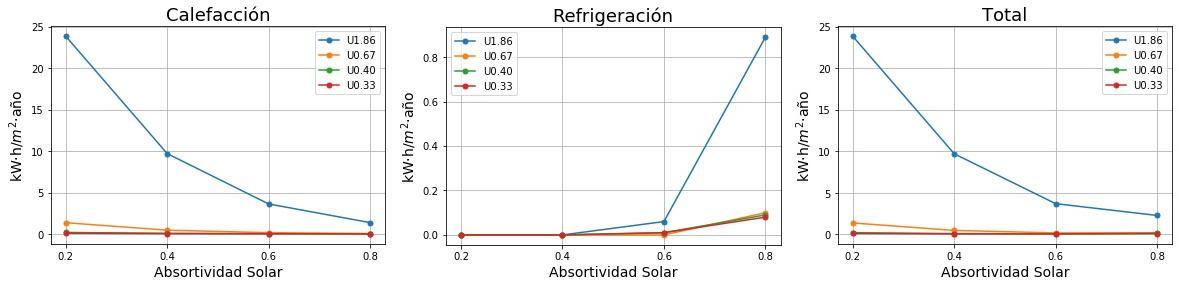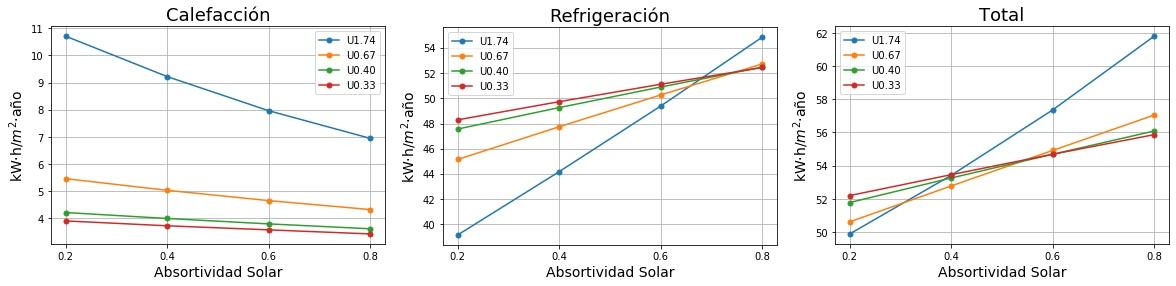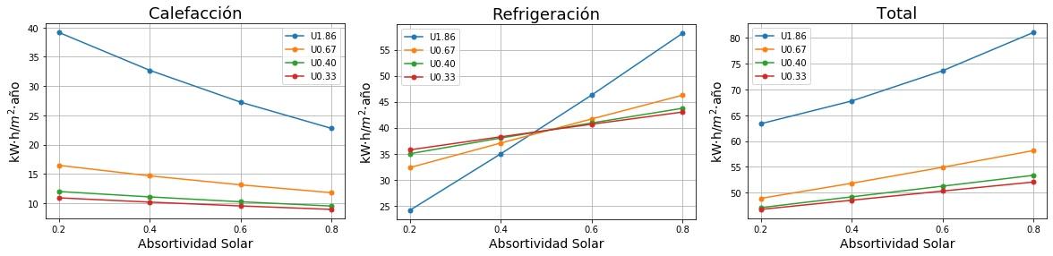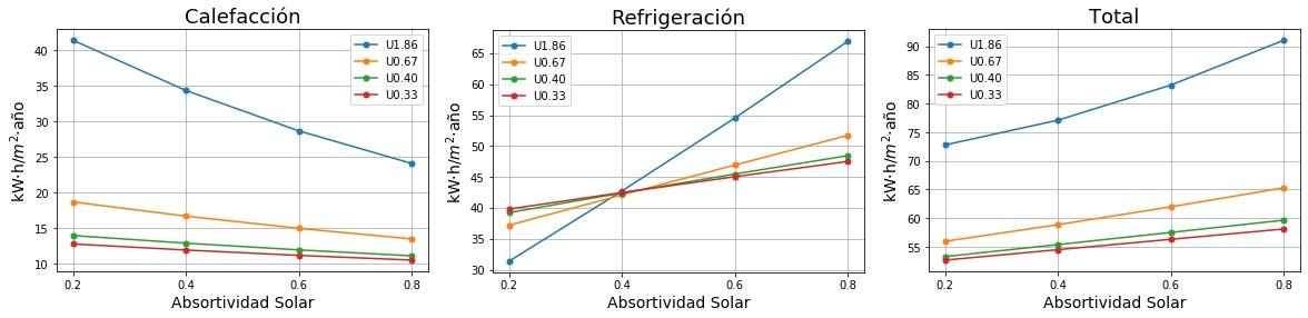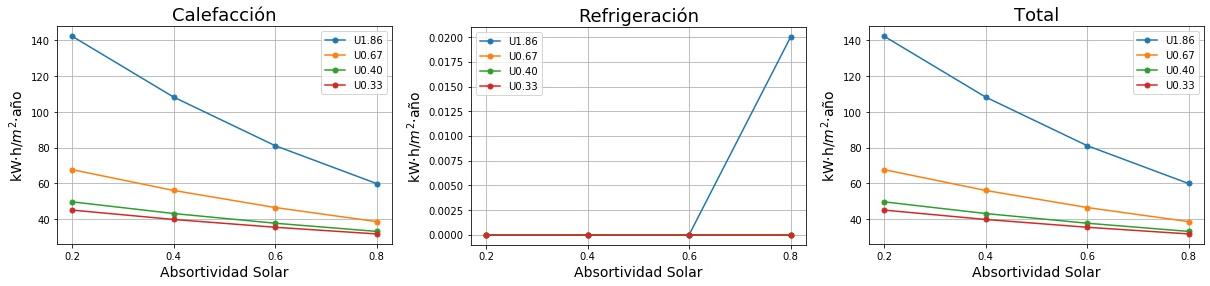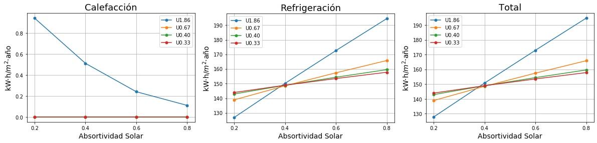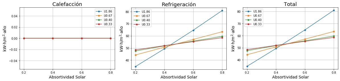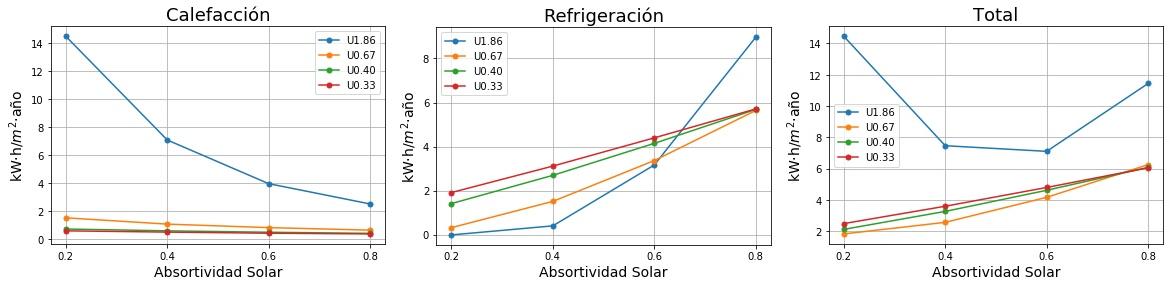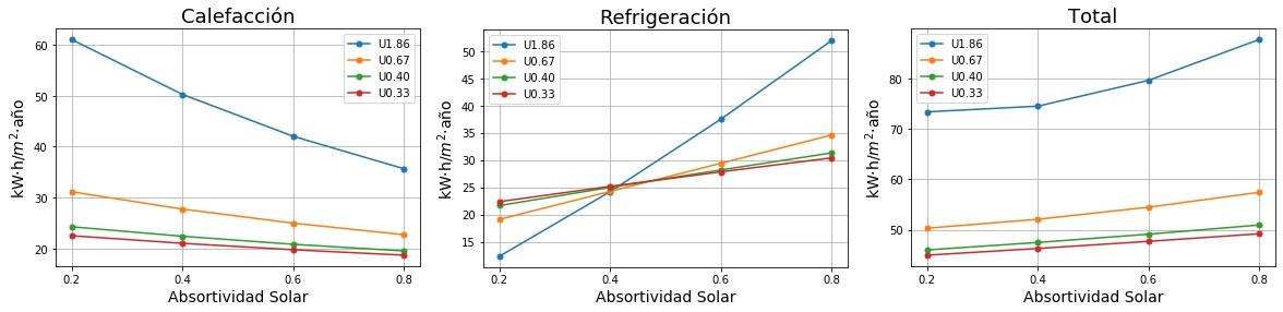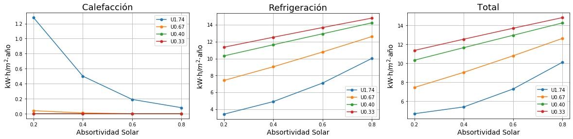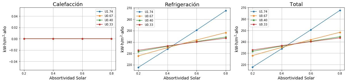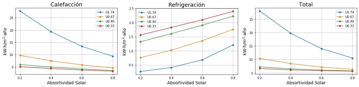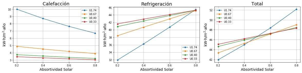 Consumos de calefacción, refrigeración y total en función de la absortividad solar del tejado para cuatro valores de Transmitancia térmica (U) del tejado. 0.2 sería un tejado fresco de color blanco y 0.8 un tejado estándar de color marrón