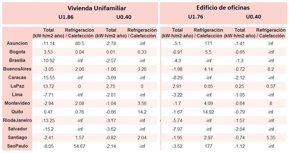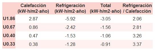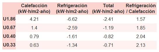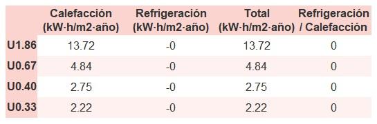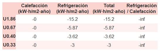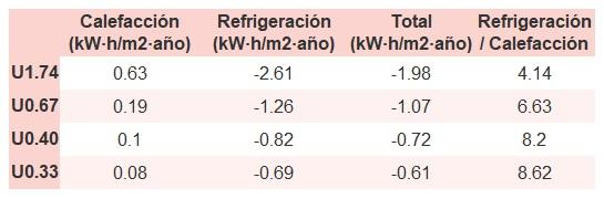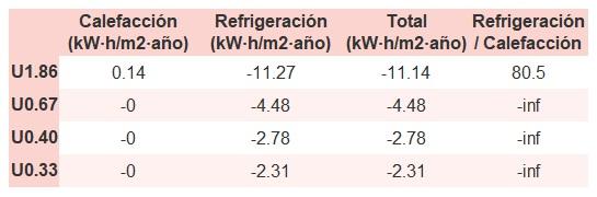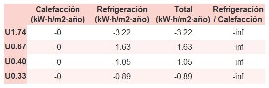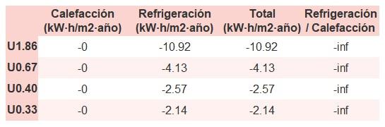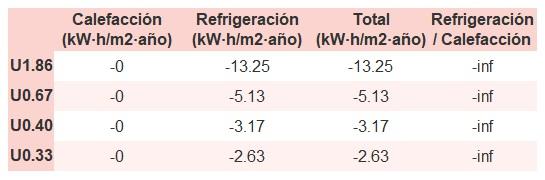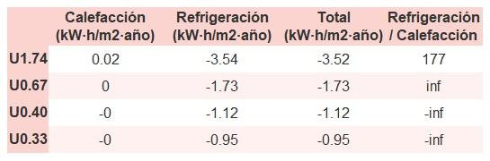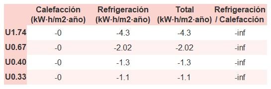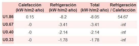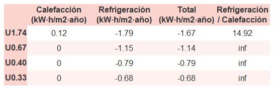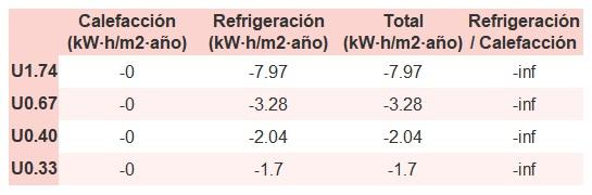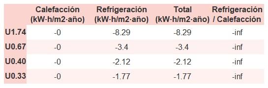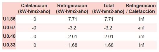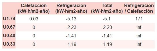 - Si «Total (kW·h/m2·año)» (penalización en calefacción menos ahorros en refrigeración) es un número negativo y «Refrigeración/Calefacción» (ahorros en refrigeración dividido entre penalización en calefacción) es mayor que 0, indica que el ahorro en refrigeración es mayor que la penalización en calefacción reduciendo la absortividad solar y utilizando un tejado fresco